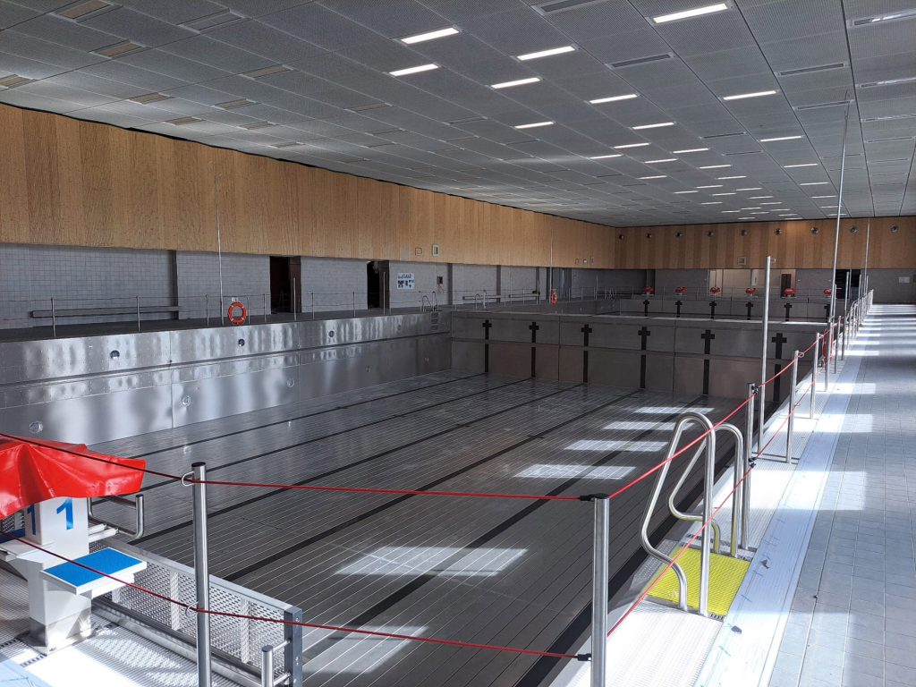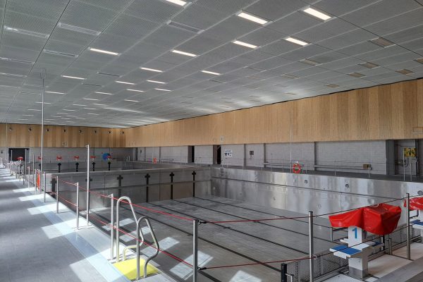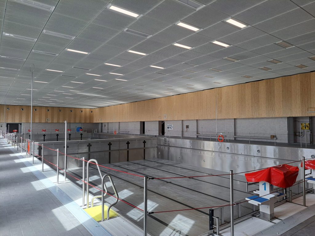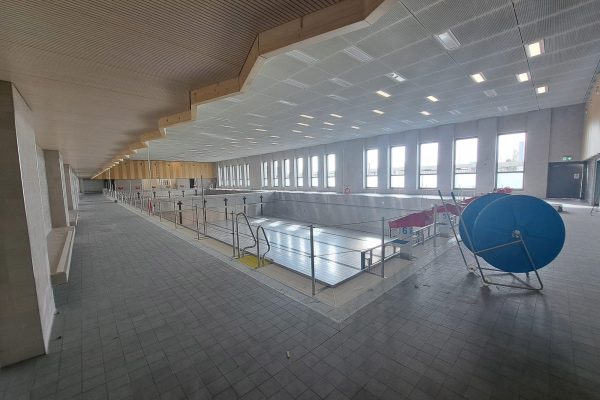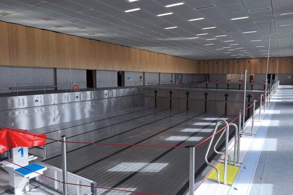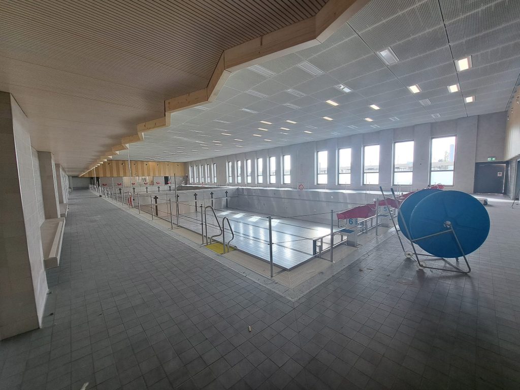 Aktuell wird eine 17 m lange Trennwand in das Gebäude eingebracht. Die gesamte Anlage wird im Gleichklang mit dem Material für das Edelstahlbecken komplett aus Edelstahl realisiert.